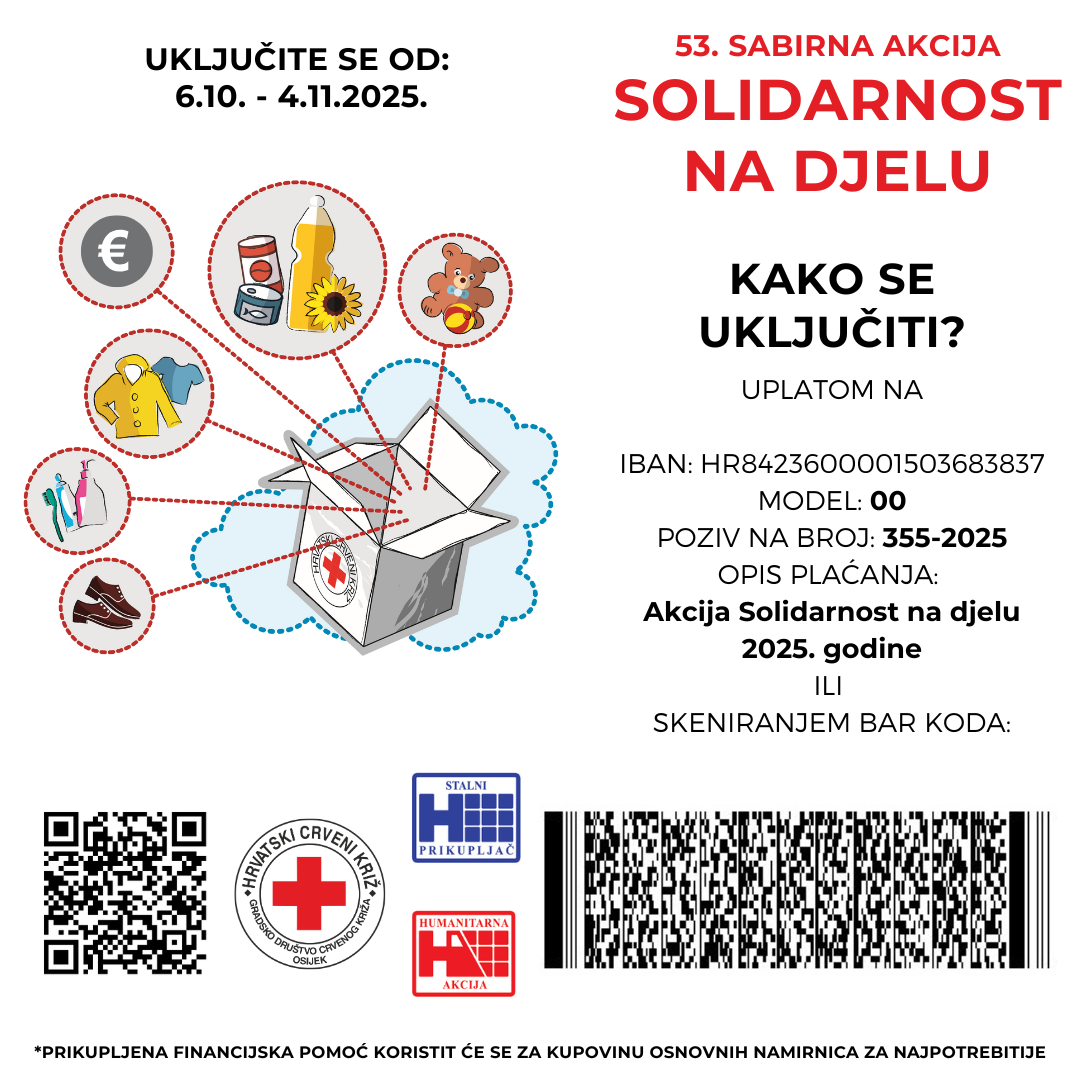 S današnjim danom započela je 53. sabirna akcija Solidarnost na djelu. Uz kampanje prikupljanja donacija u suradnji s osnovnim i srednjim školama te provedbu akcije Vaš dar za pravu stvar u Trgovačkom centru Kaufland, akciju Solidarnost na djelu možete podržati i putem uplata na žiro račun Crvenog križa Osijek koji je otvoren za potrebe prikupljanja sredstava ili skeniranjem koda za uplatu. Prikupljena financijska sredstva koristit će se za kupnju namirnica za naše najpotrebitije sugrađane.