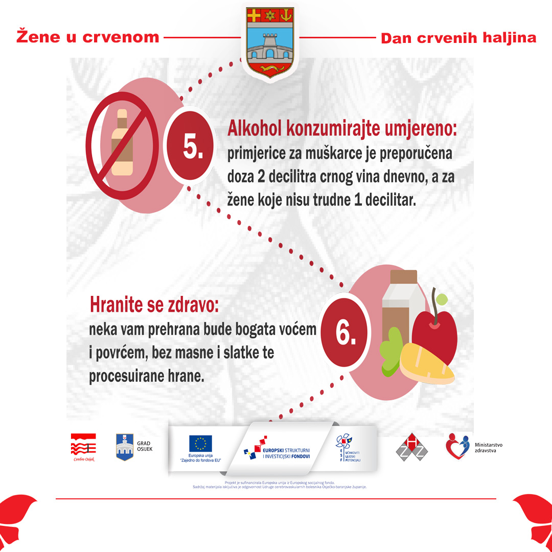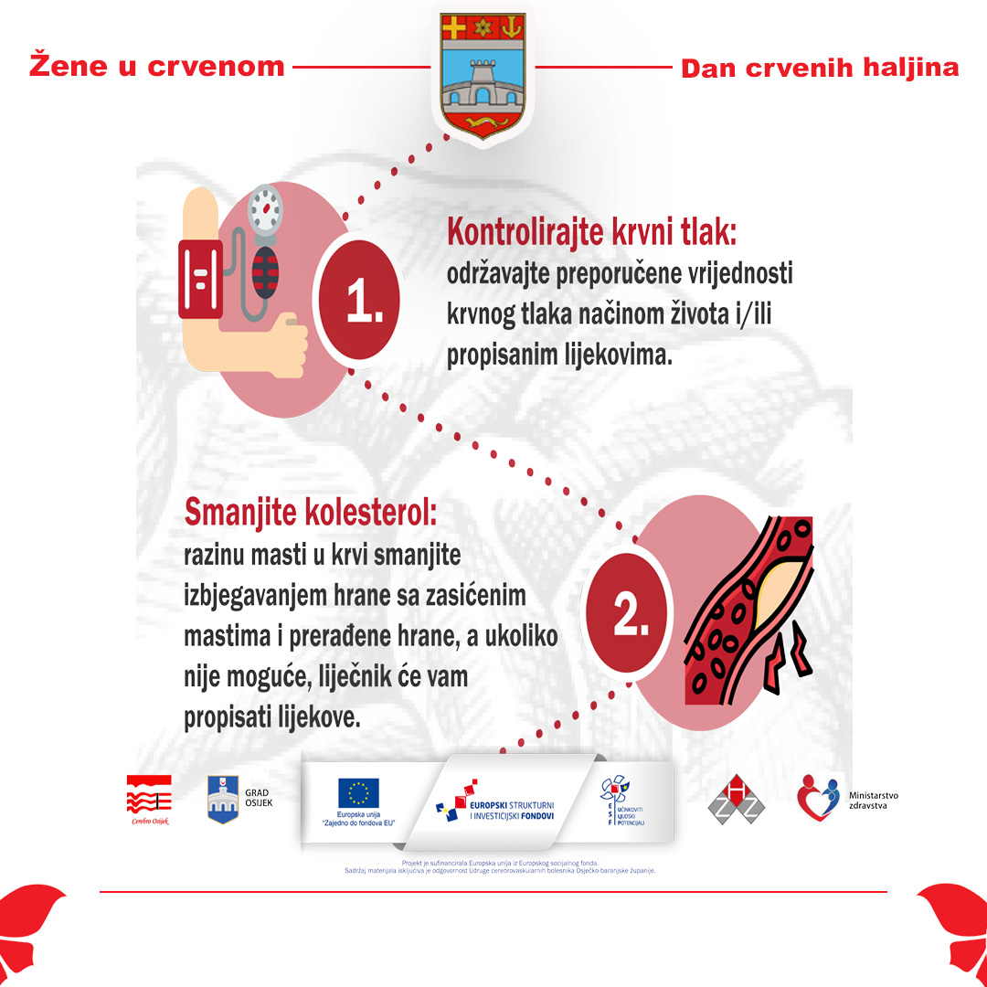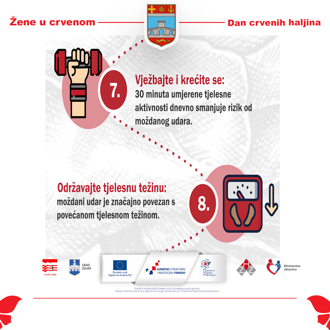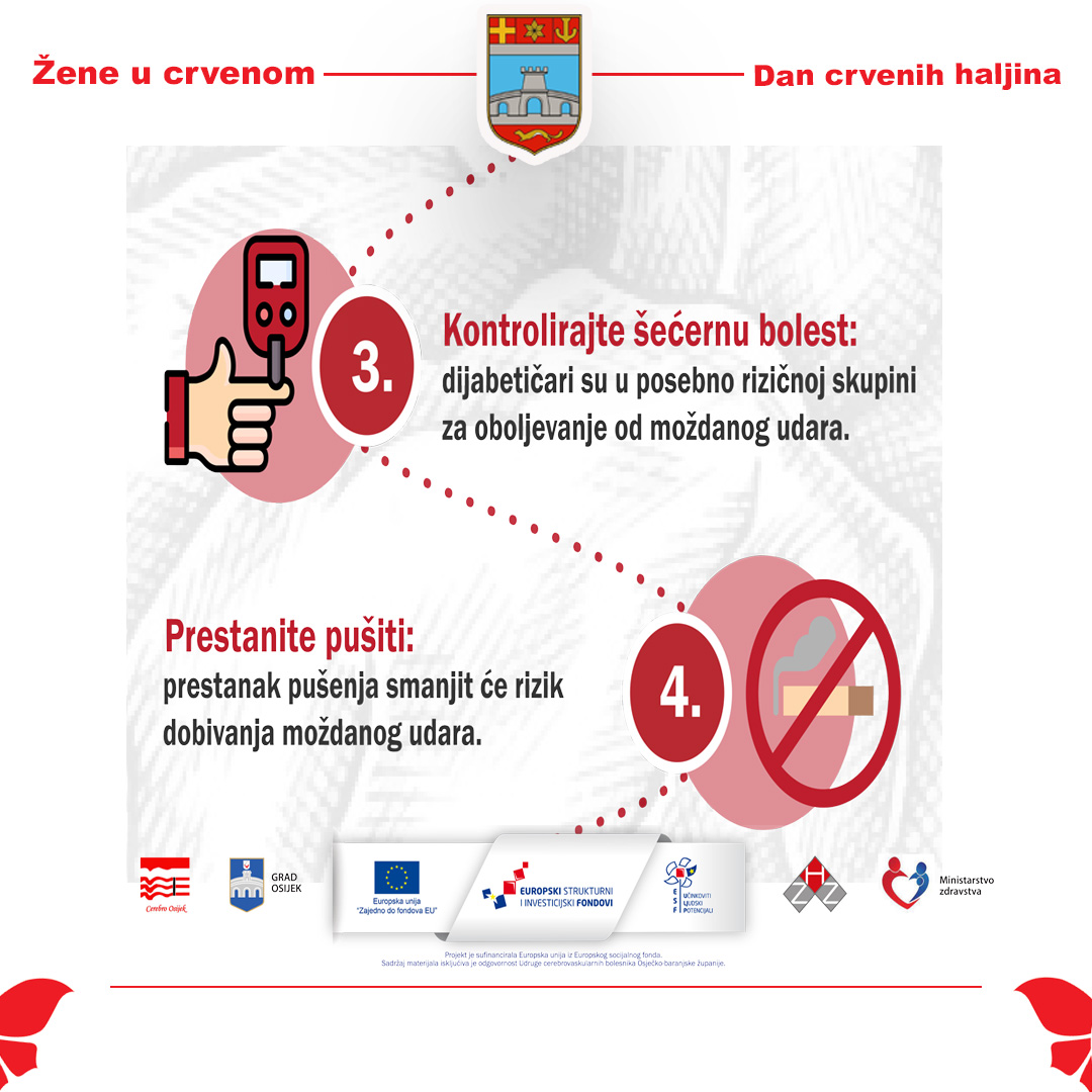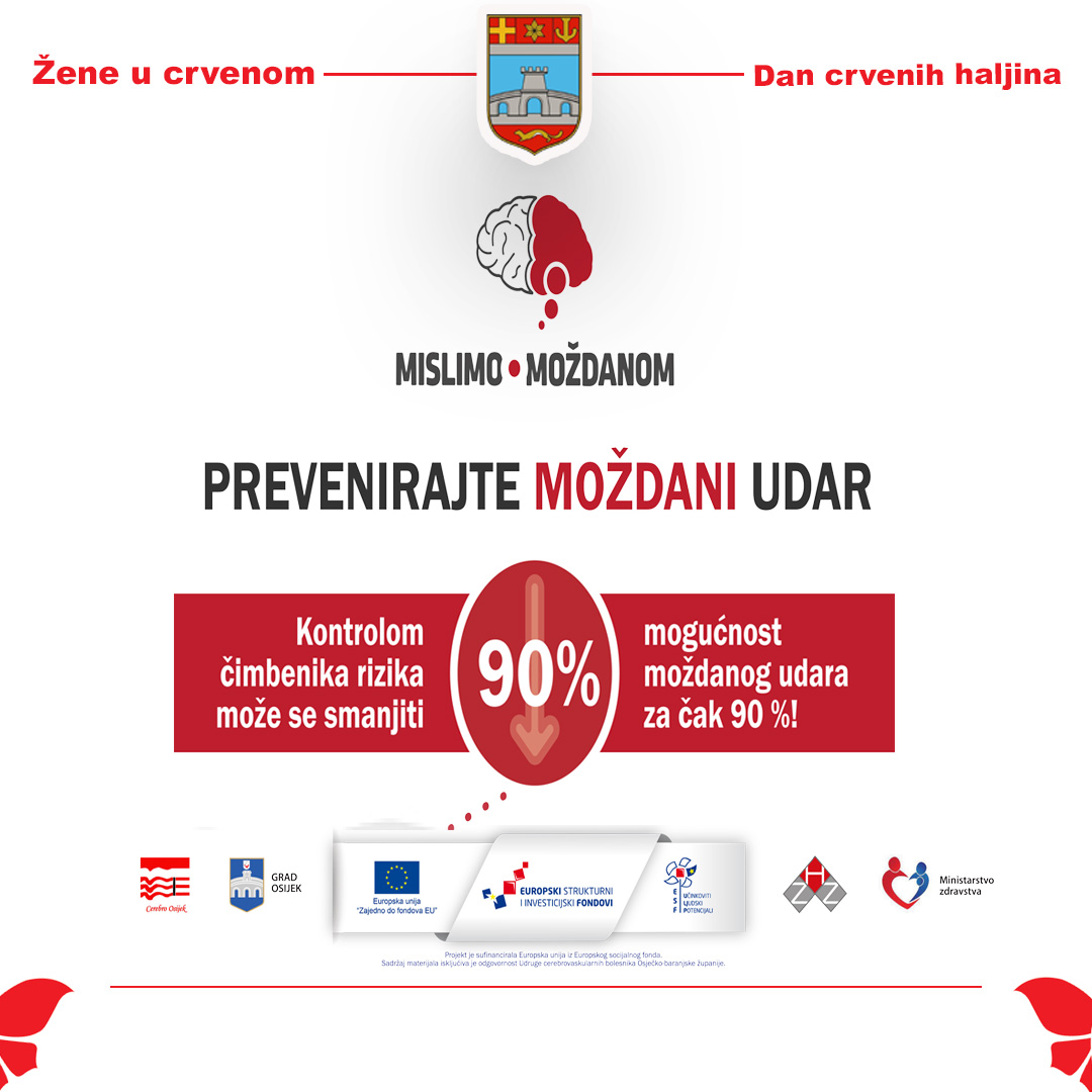 Tim povodom, Gradsko društvo Crvenog križa Osijek i ove se godine aktivno uključuje u javnozdravstvenu manifestaciju „Žene u crvenom“, kojom Osječko-baranjska županija već osmu godinu zaredom skreće pozornost javnosti na ovu važnu zdravstvenu temu. Brojna istraživanja pokazuju kako se velik dio moždanih udara može spriječiti usvajanjem zdravih životnih navika, pravodobnim liječenjem rizičnih čimbenika te brzom reakcijom na prve simptome.