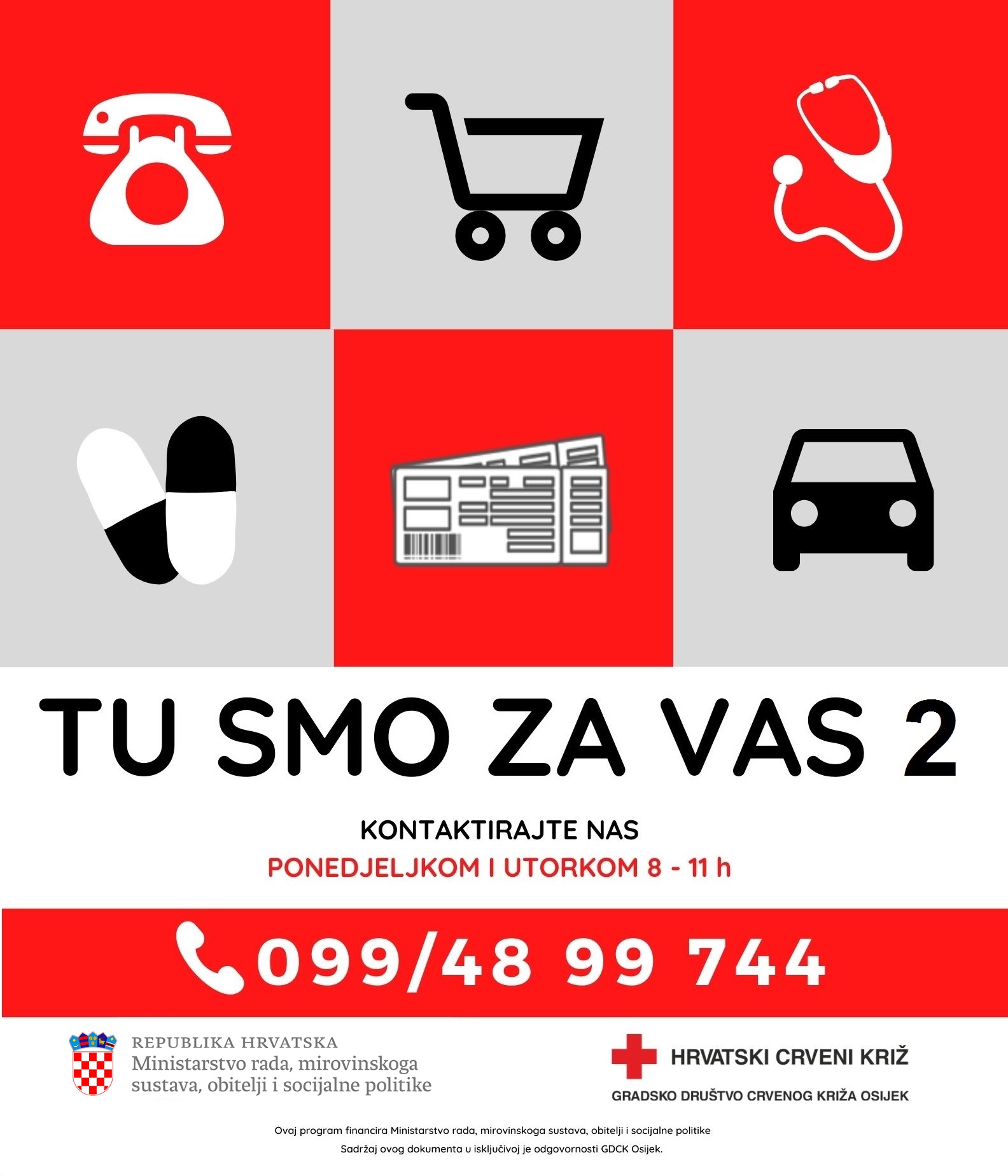 Započela je 3. godina provedbe programa “Tu smo za vas 2”. Naši zaposlenici i dalje su tu za naše korisnike. Programom se provode aktivnosti SOS telefona za starije (65+) i teško bolesne osobe s ciljem pružanja usluga dostave namirnica, lijekova i plaćanje režijskih računa za korisnike s područja grada Osijeka te prijevoza kod liječnika za korisnike s područja općina Antunovac, Čepin, Ernestinovo, Šodolovci, Vladislavci, Vuka, Erdut te grada Osijeka s prigradskim naseljima.